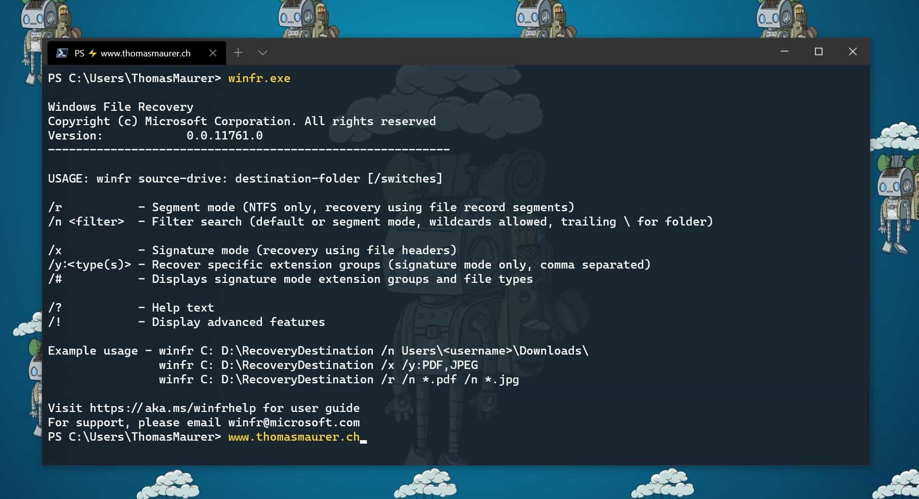 winfr C: D: /n \Users\<nombreusuario>\Documentos\Archivo.docx: Recupera un archivo específico.En el comando debes de cambiar todas las direcciones y el nombre del archivo.winfr C: D: /n \Users\<nombreusuario>\Imagenes\*.JPEG /n \Users\<username>\Imagenes\*.PNG: Recuperas todas las imágenes de los formatos jpeg y png que tuviera en la carpeta de Imagenes dentro de C:, y lo lleva a una carpeta de recuperación en D:. Debes de cambiar las rutas las unidades para replicarlo en otras unidades.winfr C: D: /n \Users\<username>\Documentos: Recupera todo el contenido de tu carpeta de documentos en la carpeta de recuperación dentro de la unidad D.winfr C: D: /r /n *.pdf /n *.docx: Recupera todos los archivos PDF de C dentro de D. El comando /r que introducimos aquí sirve para indicar «cualquiera».winfr C: D: /r /n *factura*: Recupera cualquier archivo que incluyese la palabra «factura» dentro de la unidad D.